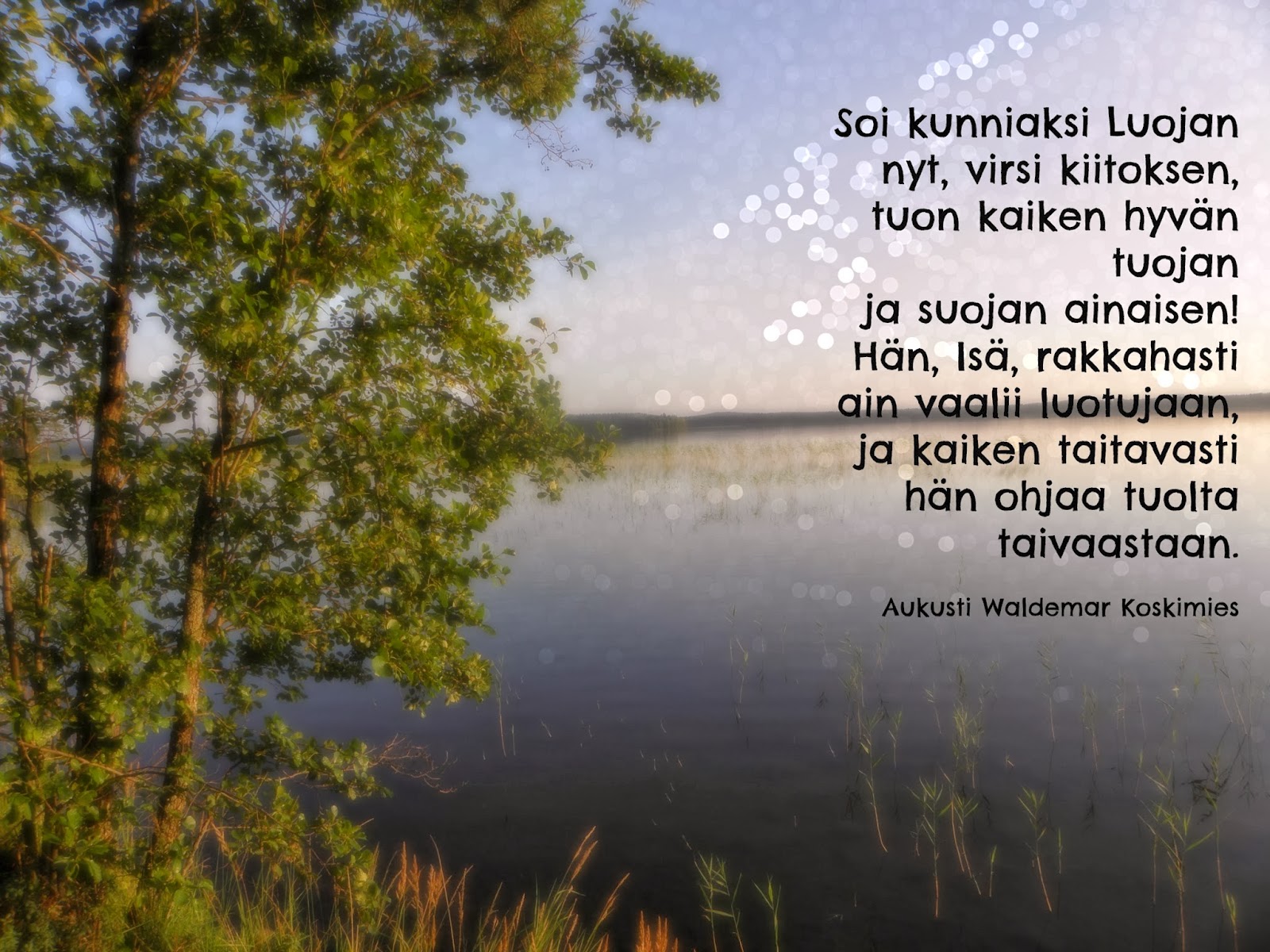 | 1. Soi kunniaksi Luojan nyt, virsi kiitoksen, tuon kaiken hyvän tuojan ja suojan ainaisen! Hän, Isä, rakkahasti ain vaalii luotujaan, ja kaiken taitavasti hän ohjaa tuolta taivaastaan. 2. Hän säät ja ilmat säätää ja aallot tainnuttaa ja hyisen hallan häätää ja viljan vartuttaa. Hän onneen meidät ohjaa, myös aikaan vaikeaan. Sen rakkauden pohjaa ken pystyy koskaan tutkimaan? 3. Siis kiitos, Herra taivaan, kun lahjas meille toit ja päivän työhön, vaivaan taas puhtaan leivän soit. Suo, että ilomielin myös jaamme leipämme ja sydämin ja kielin sua lakkaamatta kiitämme. |